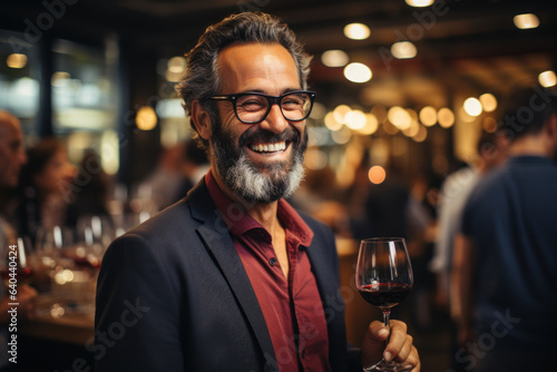 A businessman enjoys a wine tasting experience after attending a seminar, highlighting the fusion of professional growth and personal enjoyment. Generative Ai.