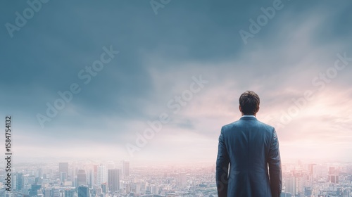 A businessman gazes over a city skyline, reflecting on opportunities under a dramatic sky. Inspiration and ambition.