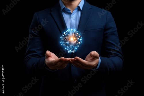 A businessman holding a glowing digital brain representation, symbolizing innovation, technology, and intelligence in business.