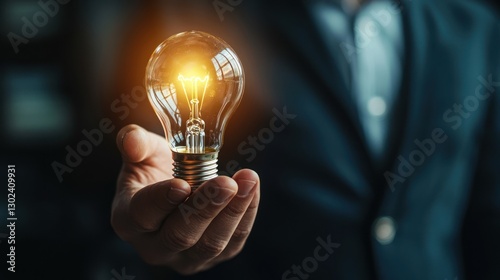 A businessman holding a glowing light bulb, symbolizing a new idea or breakthrough
