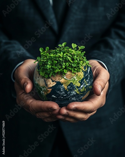 A businessman holding a green Earth with a sustainable environment icon