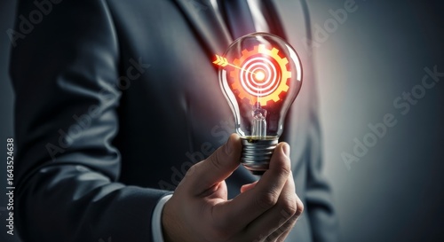 A businessman holding a lightbulb with a target and arrow inside representing a business idea