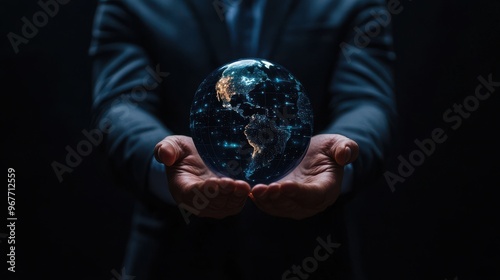 A businessman holds a global network and connectivity, with a data transfer concept represented by an earth hologram in his hand against a dark background.