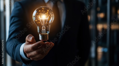 A businessman holds a glowing light bulb in his hand, symbolizing ideas and innovations with AI for business.
