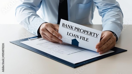 A businessman holds a loan agreement labeled "Bank Property Loan" while reviewing documents on a desk.