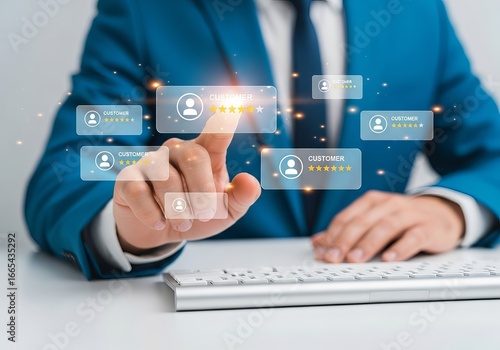 A businessman in a blue suit interacts with virtual customer feedback stars, showcasing a modern approach to customer relations.