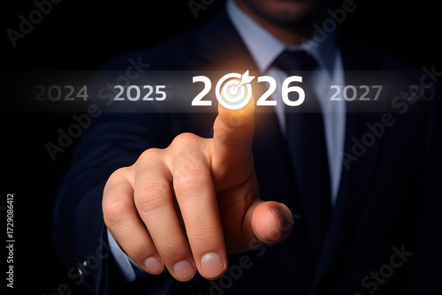 A businessman in a dark suit pointing at a glowing digital interface highlighting the year 2026 with a target icon. The futuristic concept represents business goals, future planning