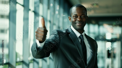 A businessman in a sleek suit gives a thumbs-up gesture, standing in a modern office with glass walls, exuding confidence and positivity.