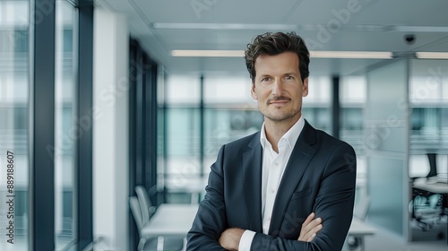 A businessman in a suit stands with his arms crossed in a modern office lobby, with large windows and a polished floor