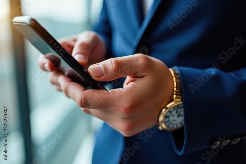 A businessman in a tailored suit checks his smartphone while standing by a large window in a modern office, showcasing a blend of technology and professionalism.