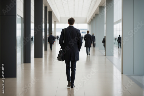 A businessman in formal attire, carrying a briefcase, walks confidently toward an airport departure gate.