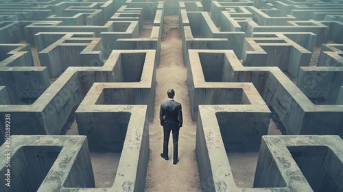 A businessman is in a huge maze, unsure of how to get out.