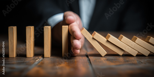 A businessman is stopping a wooden domino from falling by a hand gesture,
