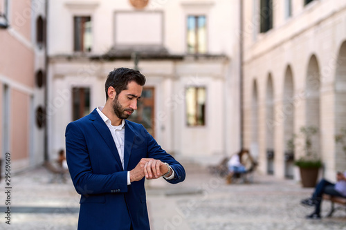 A businessman looks at a wristwatch outdoors.
