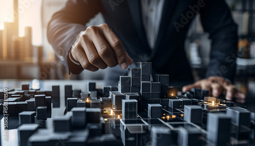 A businessman manipulates a miniature city model, possibly planning or strategizing for urban development or real estate.