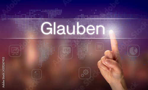 A businessman pressing a Believe "Glauben" button in German on a futuristic computer display