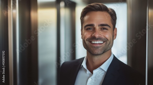 A businessman smiling confidently while standing in an elevator, ready for a business presentation.