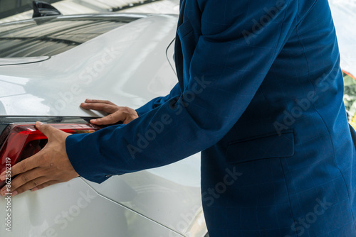 A businessman stands next to his damaged vehicle after an accident, holding a clipboard and examining the scene. An insurance agent arrives to assess the damage and start the claim process.
