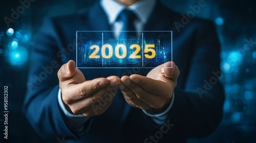 A businessman updates the status bar on a virtual screen from 2025 to 2026, representing the launch of a new business and life in the upcoming year.