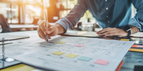 A businessman uses a virtual calendar to plan his work schedule. He manages his time effectively for projects and meetings, using reminders to stay on track.