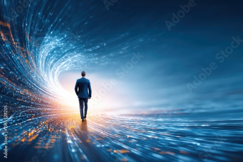 A businessman walks toward a bright, swirling digital tunnel representing future technology and data flow.