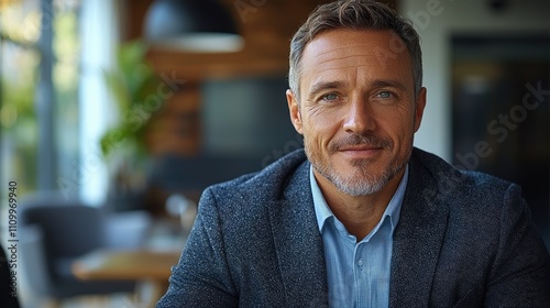 A businessman with a warm smile is seated at a stylish conference table, highlighting his approachable persona in a modern and inviting environment