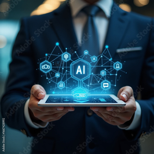 A businessman with confidently presenting with a tablet modern, tech-inspired office environment