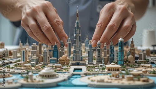 A businessman's hand gestures towards a miniature cityscape model on a desk