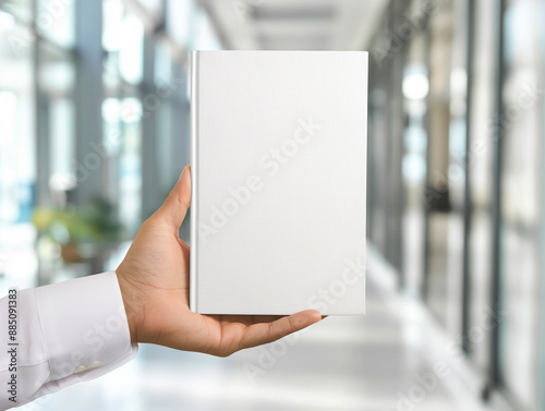 A businessman's hand holds a white book blank without text. Mockup for advertising