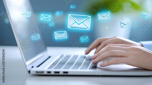 A businessperson typing an email on a laptop with an email icon hovering above