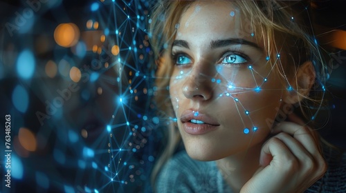 a businesswoman as she meticulously draws out a global network structure and client connection data exchange on a dark background.