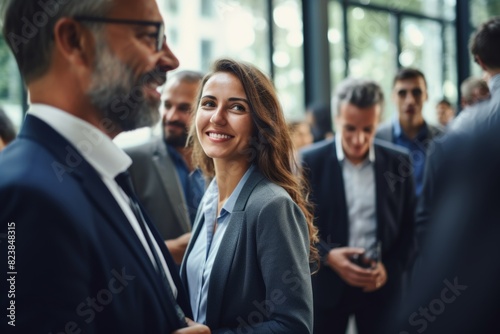 A businesswoman in professional suit outfits with glasses is smiling while greeting others in a business meeting conference. Generative AI.