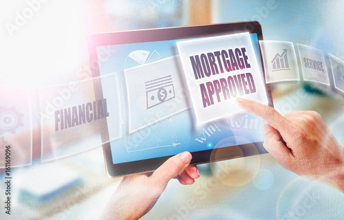 A businesswoman selecting a Mortgage Approved business concept on a futuristic portable computer screen.