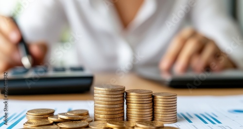A businesswoman sitting at a desk with a stack of coins and a calculator in a financial plan