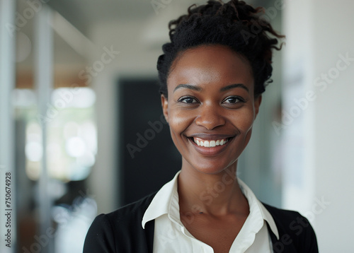 A businesswoman with a black blazer and white shirt is smiling, generative ai