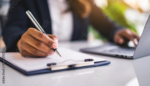 A businesswoman's hand holding a pen, poised to write on a form atop a white table. The macro focus highlights the meticulousness and attention to detail required in business documentation