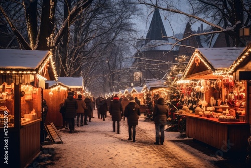 A bustling Christmas market at twilight, with snow-covered stalls, festive lights, and visitors enjoying the wintry ambiance.