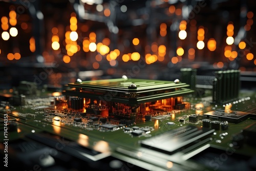 A bustling city at night, illuminated by the vibrant lights of a circuit board within a towering building