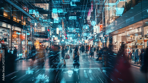 A bustling city street scene featuring vibrant lights, digital effects, and blurred crowds, conveying a lively urban atmosphere.