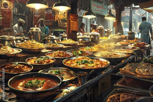 A bustling curry house with pots of fragrant curry bubbling away, plates of naan bread, and bowls of steamed rice.