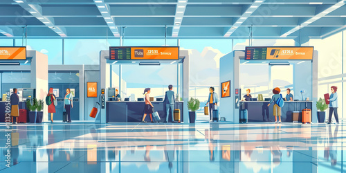 A bustling, international airport bank branch, catering to travelers from all over the world, with multilingual staff and currency exchange services.
