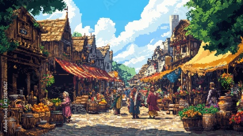 A bustling medieval market street scene with vibrant shops and people