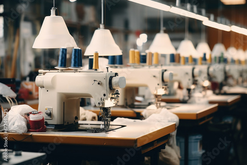 A bustling textile factory with rows of sewing machines, representing the Concept of textile manufacturing and the fashion industry. Generative Ai.