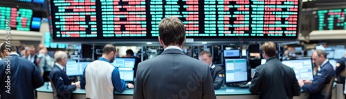 A bustling trading floor with professionals analyzing stock prices and making quick decisions in a dynamic financial environment.