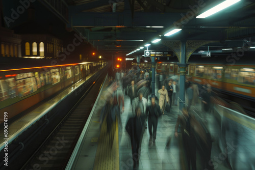 A bustling train station with blurred figures rushing to catch their trains, capturing the dynamic energy and movement in the urban environment.