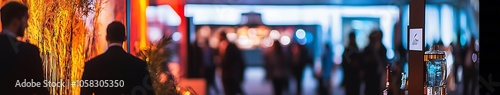A bustling urban scene illuminated by vibrant lights, showcasing silhouettes of people walking past colorful shops.