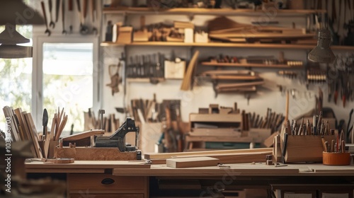A bustling woodworking studio with tools and crafted wooden pieces, Woodcraft tools neatly displayed in a workshop setting, Artisan woodworking style