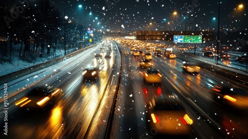 A busy highway during a winter storm at night, with heavy snow falling and creating a whiteout effect.