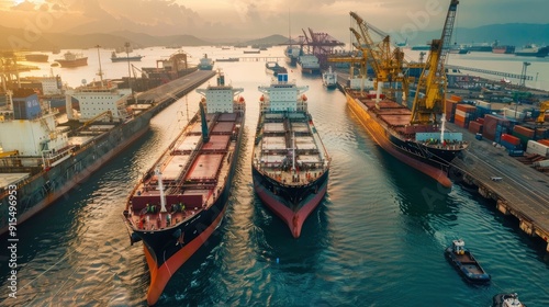 A busy shipyard with massive cargo ships being loaded and unloaded.