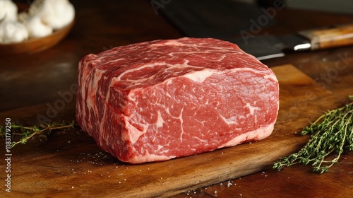 A butcher displaying a fresh side of beef, with marbled fat visible and a sharp cleaver nearby.